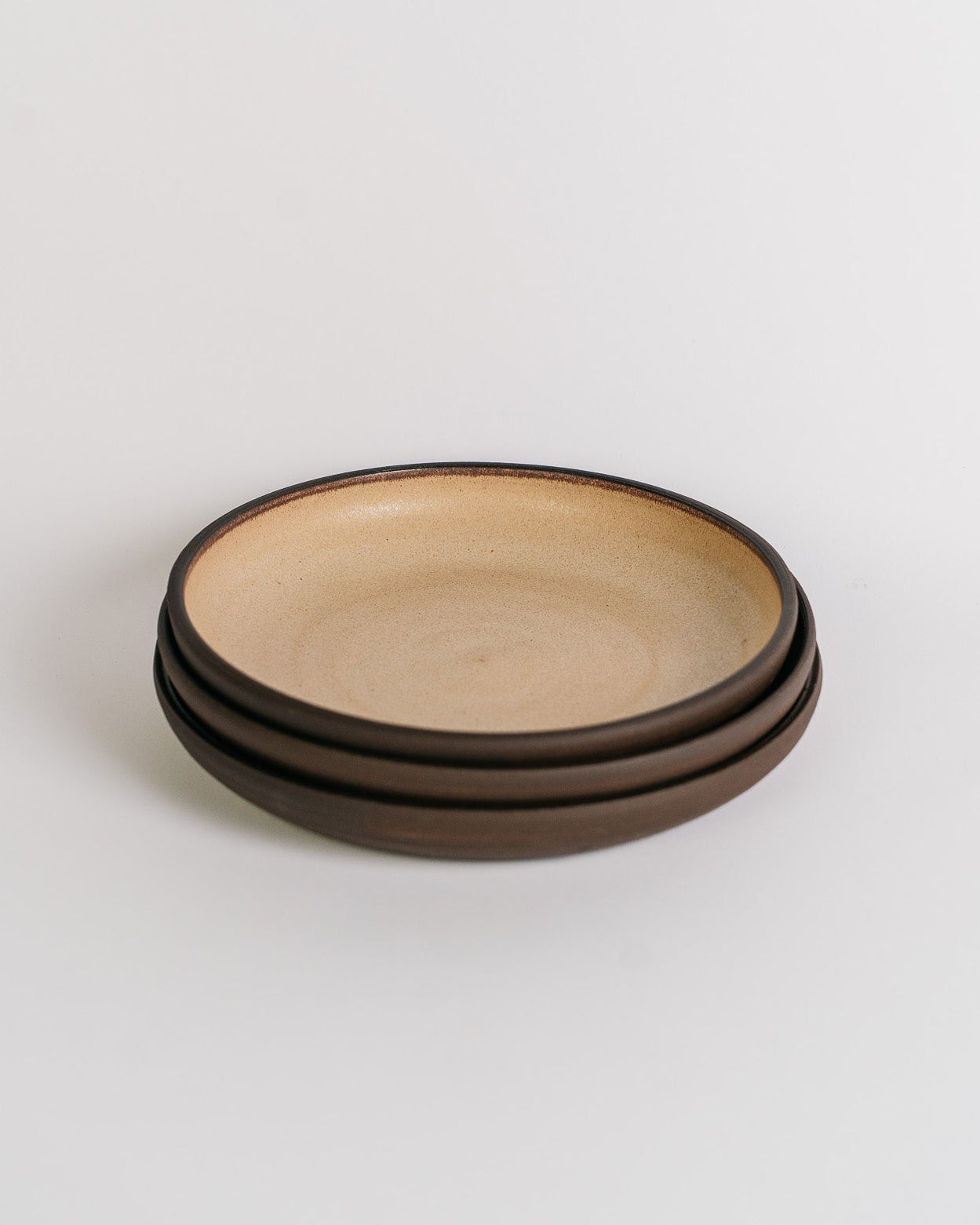 A hand thrown wide dish somewhere between a bowl and a plate (lovingly referred to as a blate) made in a dark brown stoneware clay with a solid coat of matte cream glaze inside and a bare clay exterior