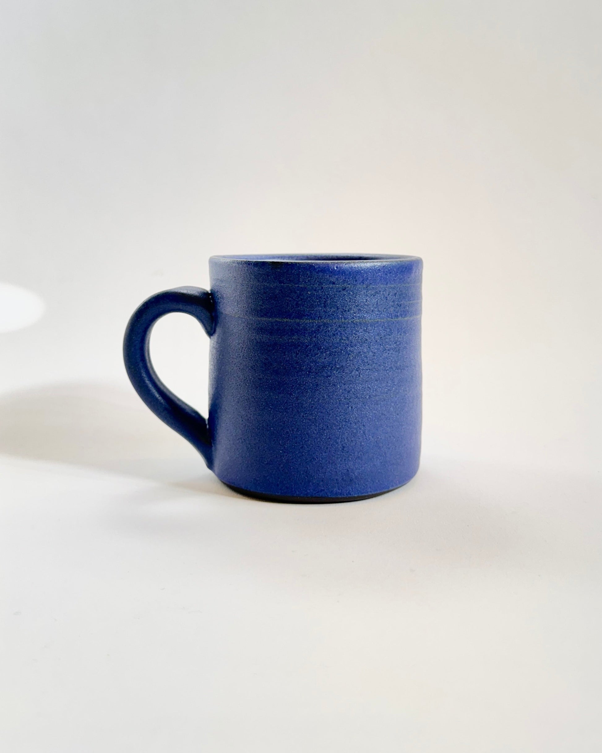 A hand thrown mug made in a brown stoneware clay with a semi-matte lapis lazuli glaze.