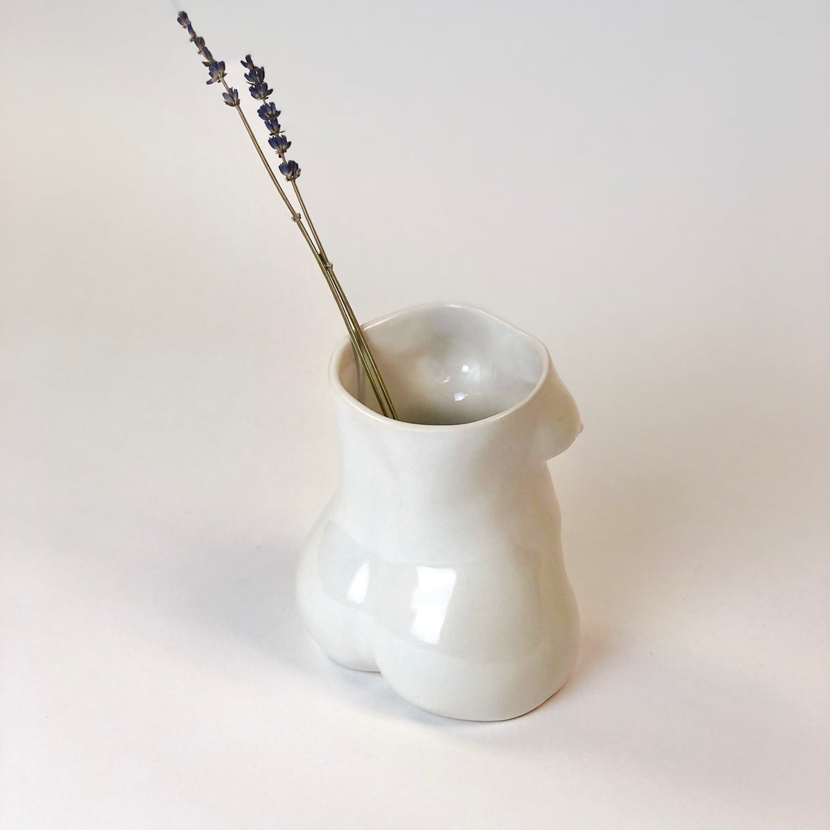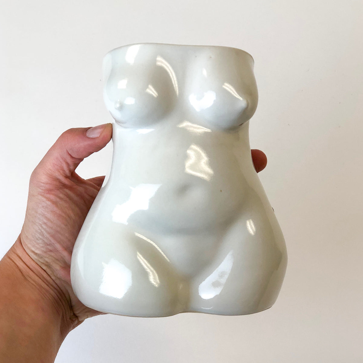 Porcelain slip cast of a coil built sculpture of a female bust. Glazed with a glossy white glaze inside and out.