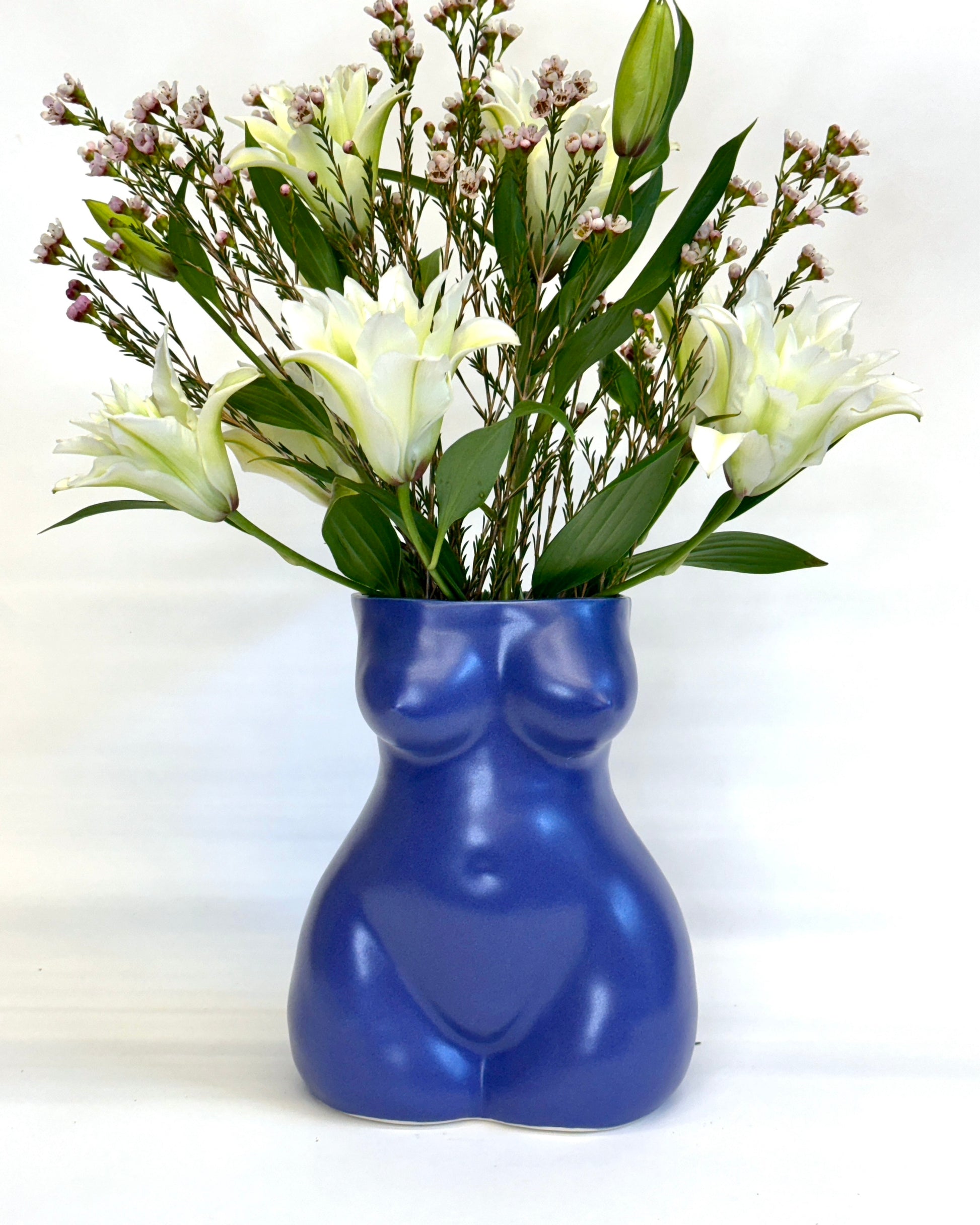 As the original piece in a series of coil-built and slip-cast stoneware sculptures, this vase captures the essence of the goddess in every curve and detail. Finished with a rich Lapis Lazuli glaze, its bright cobalt blue matte surface envelops the piece inside and out.
