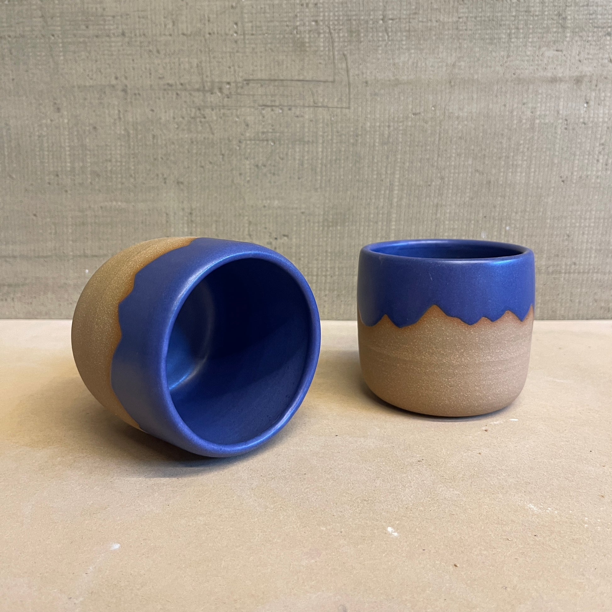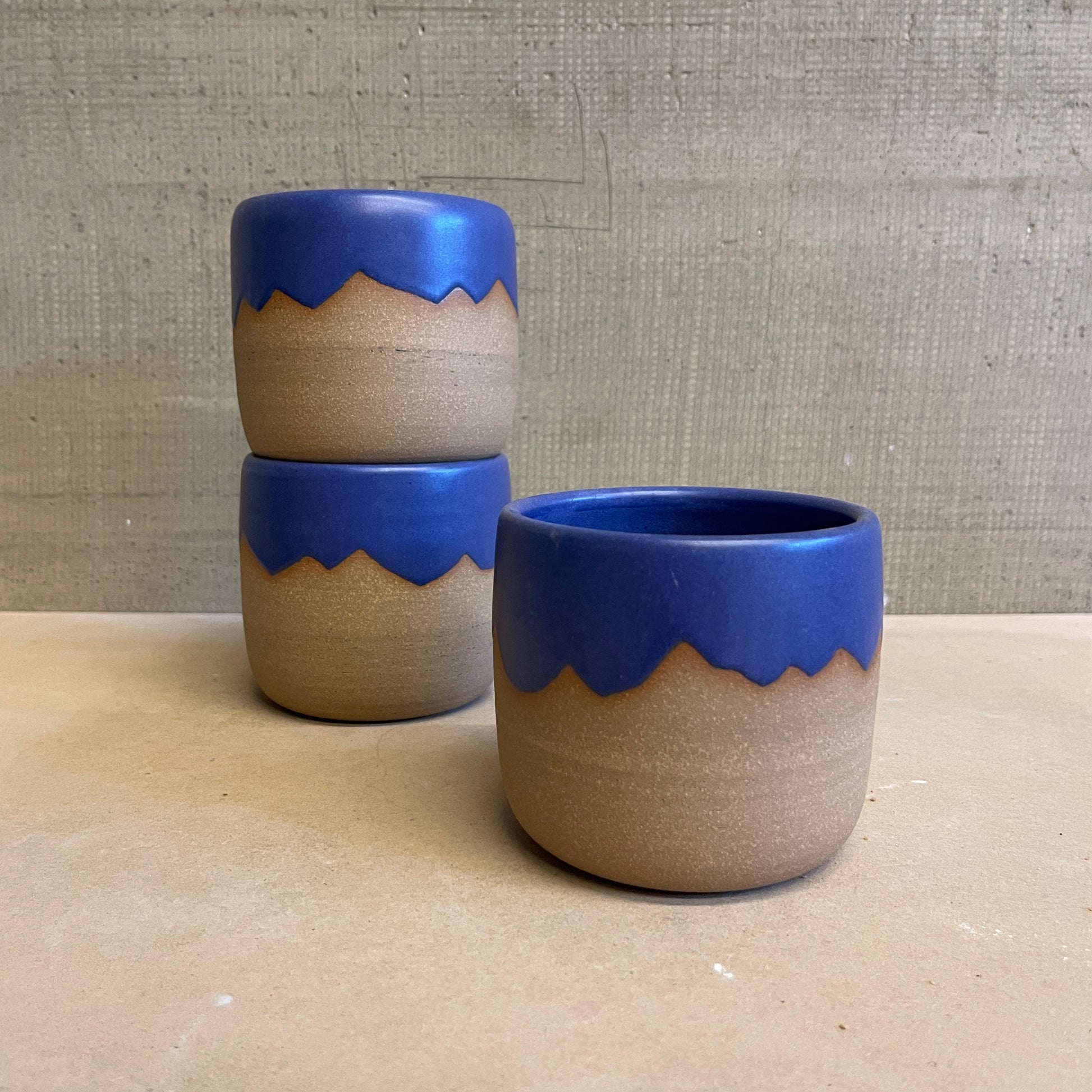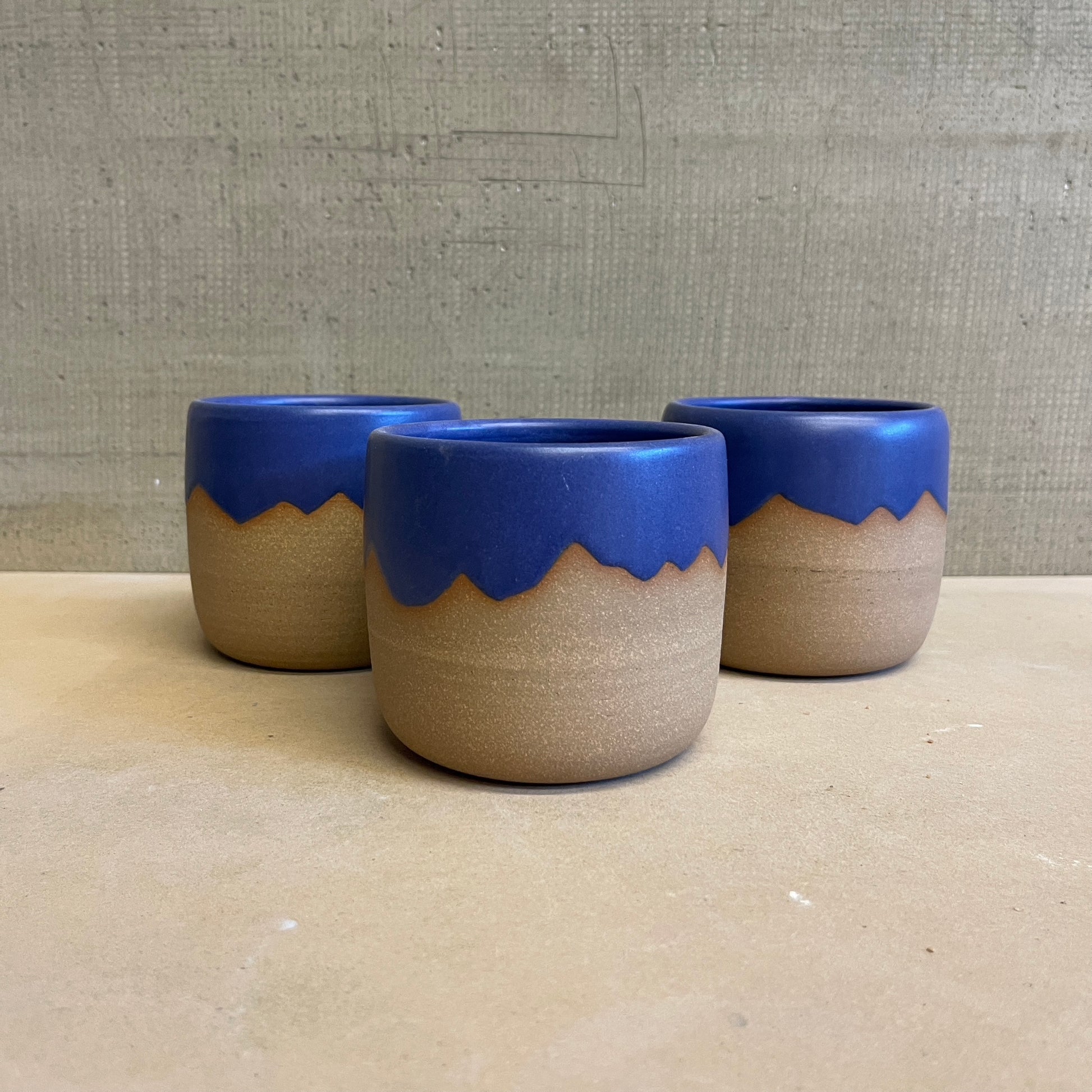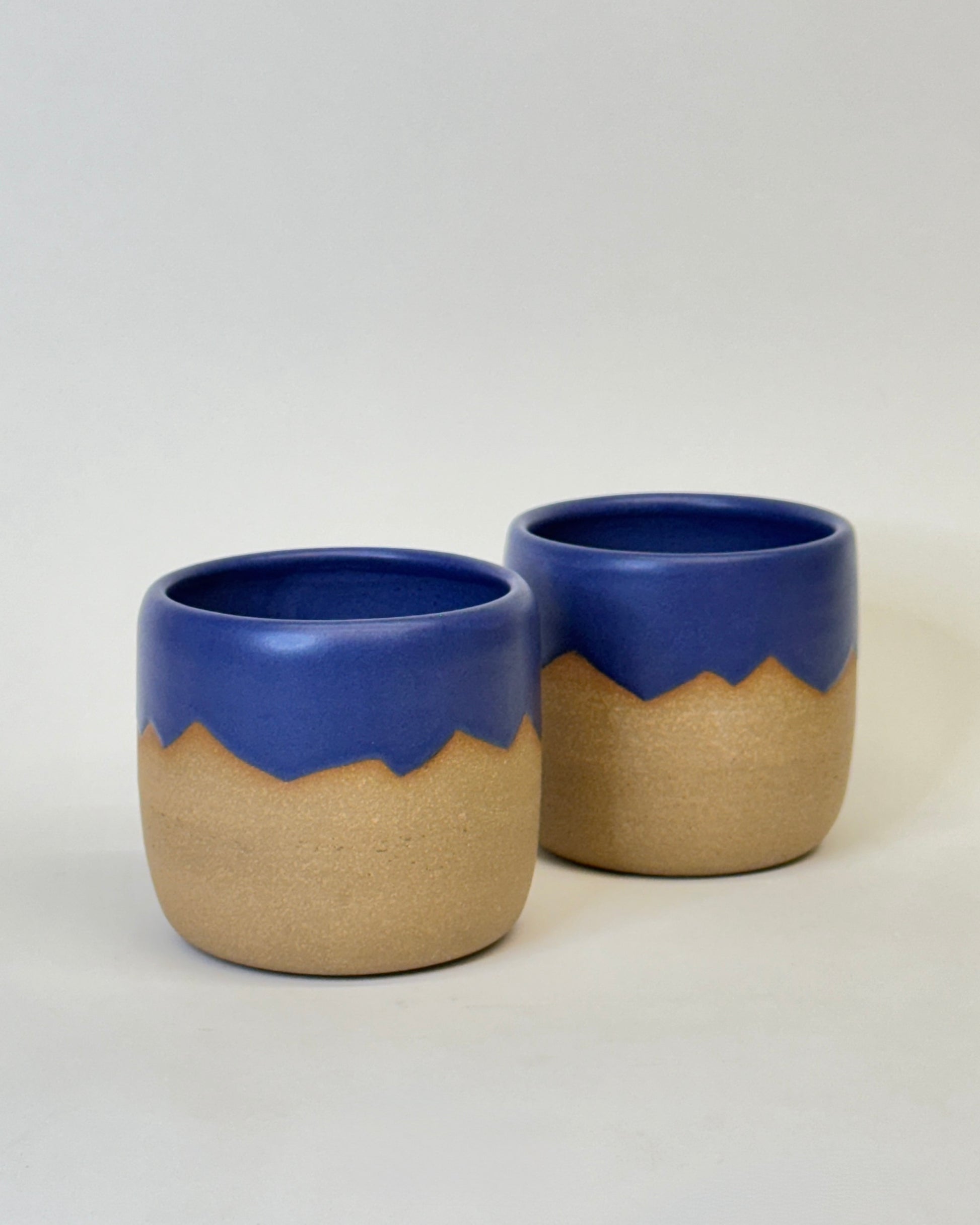 These cups were inspired by the Chisos mountains in West Texas. The glaze gasses off in the kiln and leaves a faint glow of orange at the edge of the glazed like, giving a sense of the sun setting over the mountains. The bottom half of the cup is bare stoneware clay.