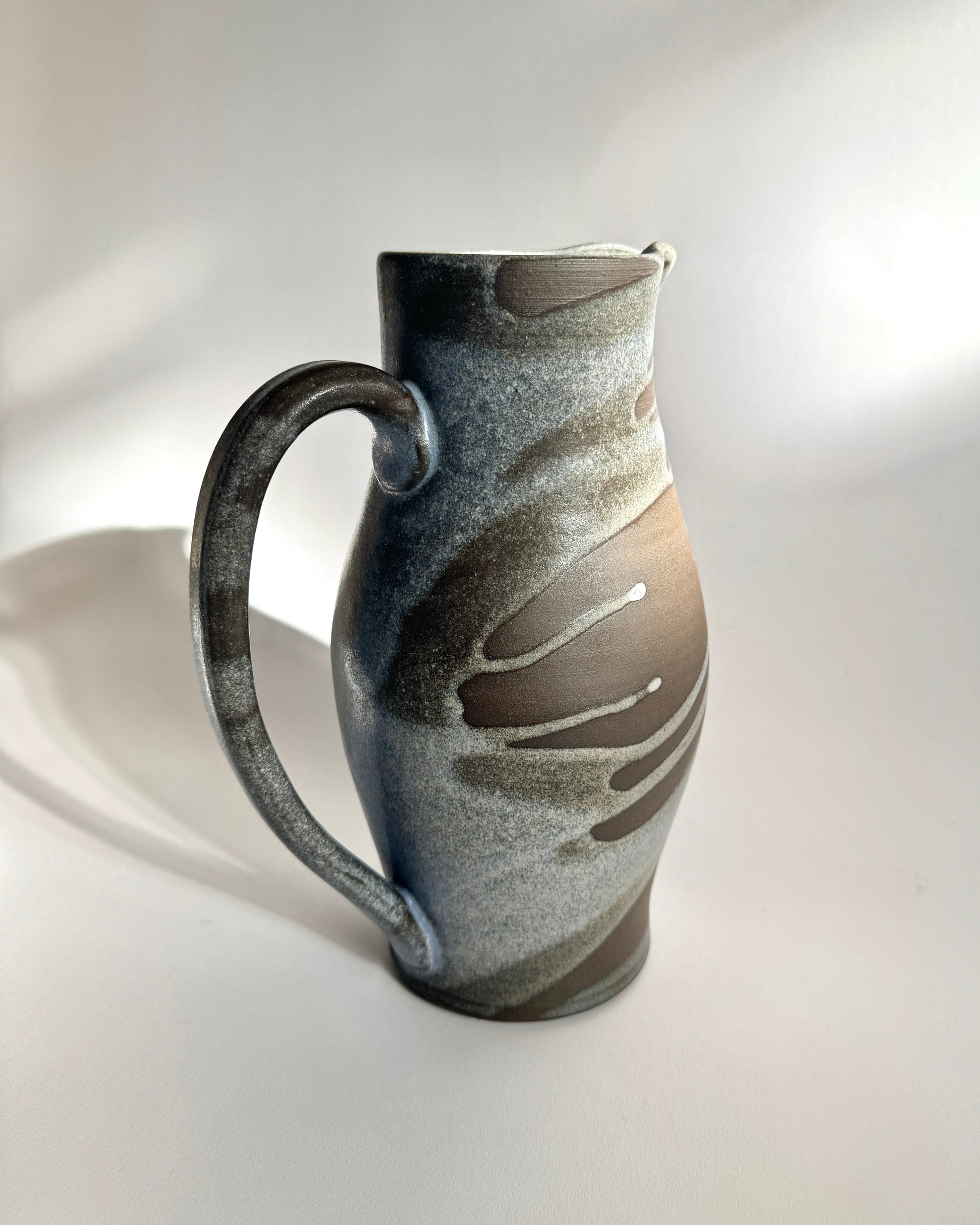 A hand thrown large pitcher made with dark brown stoneware, decorated with light blue matte glaze poured over the exterior