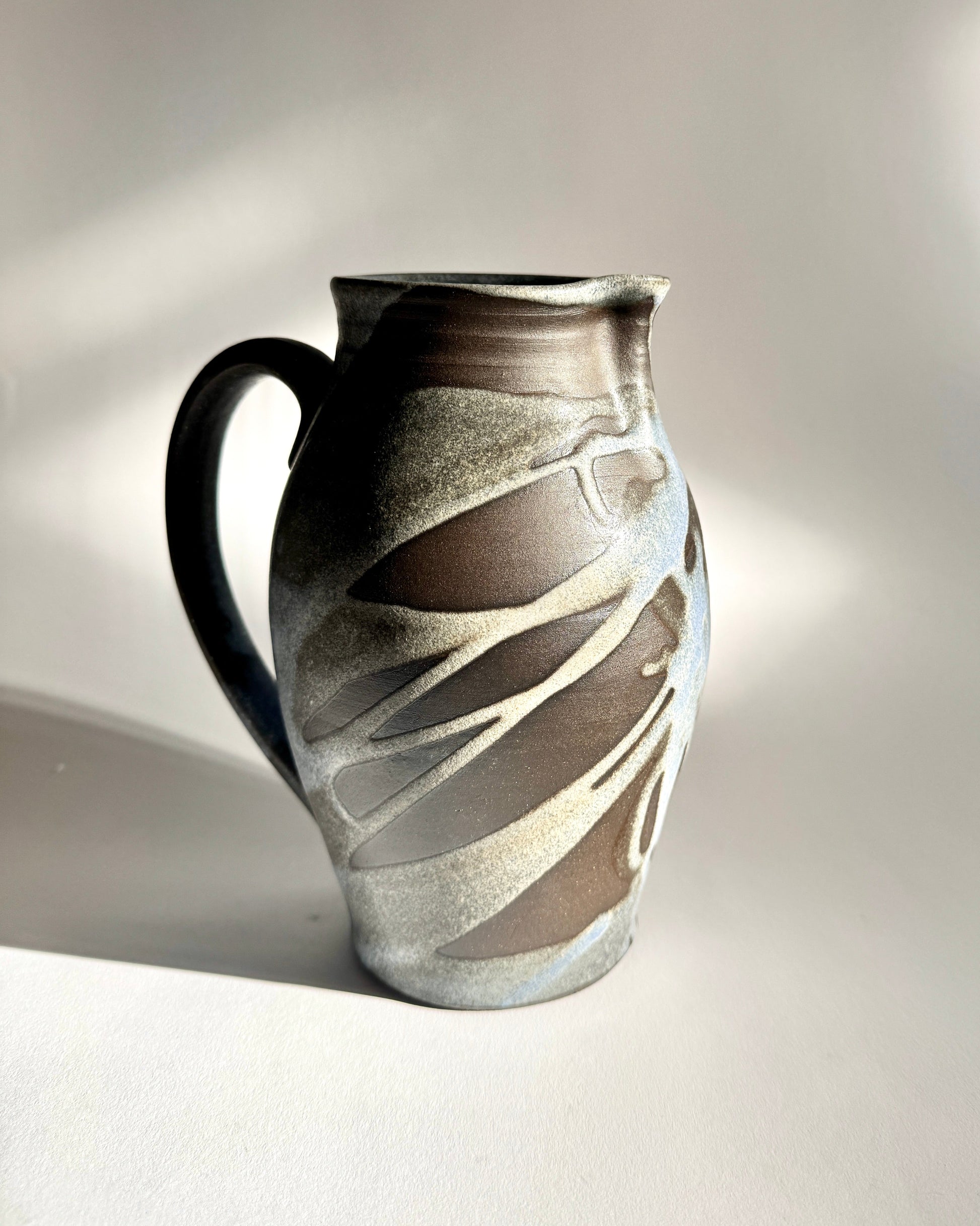 A medium height hand thrown pitcher made with dark brown stoneware, decorated with light blue matte glaze poured over the exterior