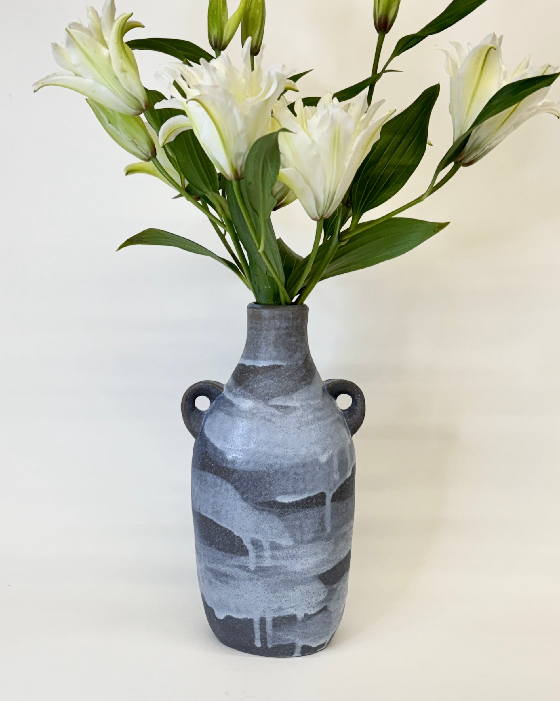 Standing at 12 inches tall, this vase features an ample mouth, perfect for displaying a small bunch of stems. It makes a striking decor piece in any space. Handmade from Texas stoneware, it’s both functional and artistic, offering a unique way to showcase your floral arrangements or simply enjoy its beauty as a sculptural accent in your home.