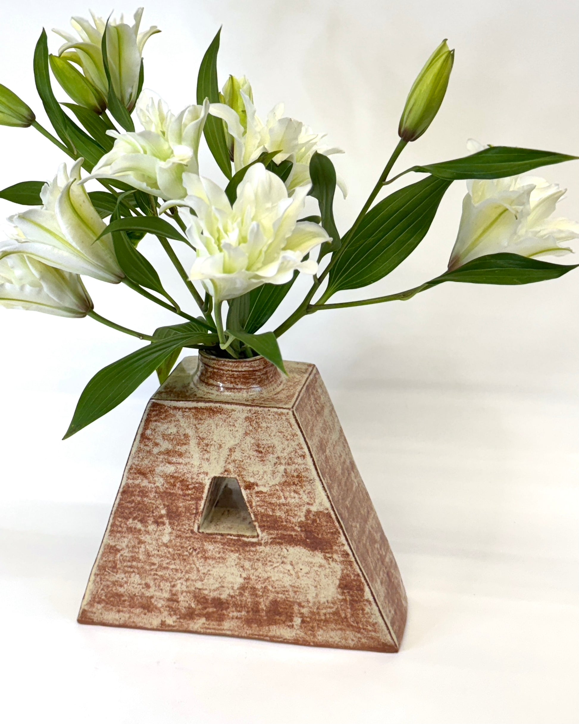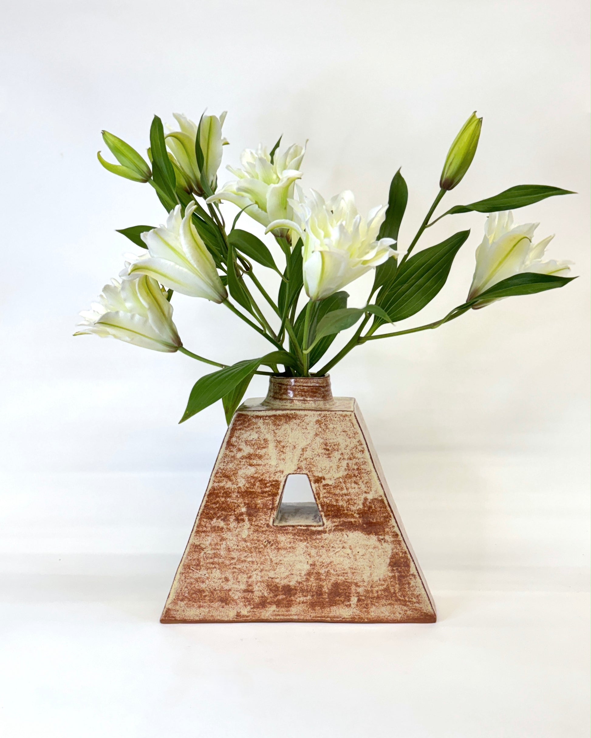 This striking triangular sculptural vase is a true statement piece, handcrafted using the traditional coil-building technique for a unique, organic shape. Its angular design and textured surface give it an architectural feel, perfect for adding an artistic touch to any room.