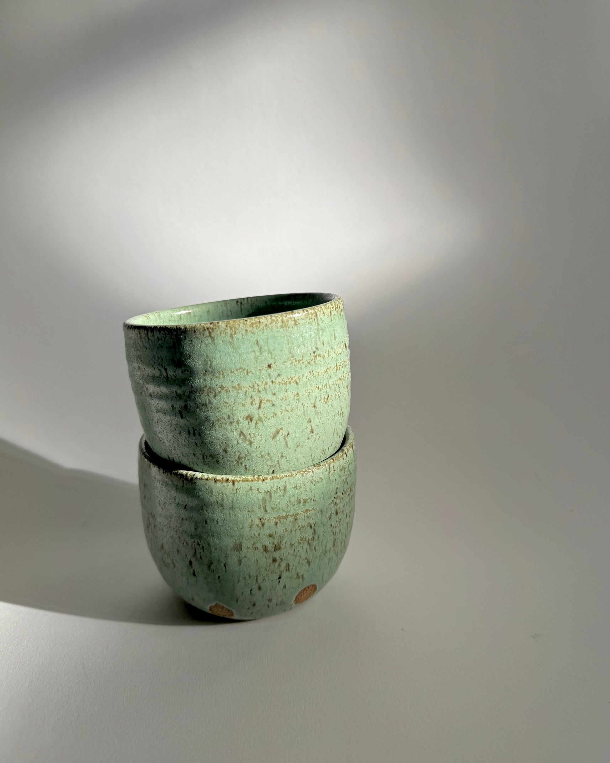 A hand thrown cup made in a speckled buff stoneware clay with a matte green glaze