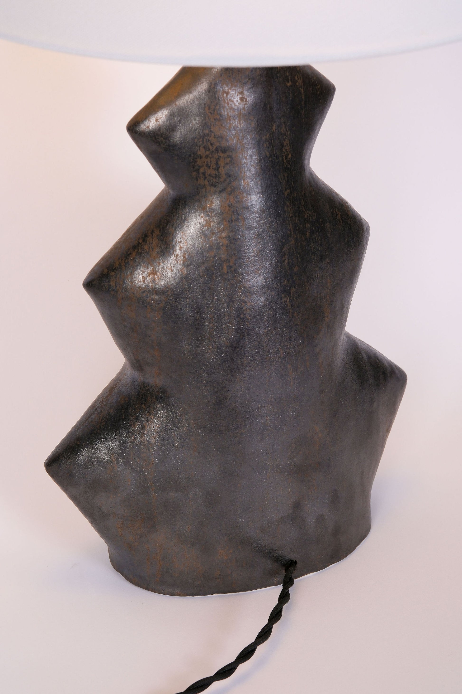 Rooted in geometry and softened by hand, the Arrow Lamp takes its name from the upward-pointing arrow—a symbol found across cultures to represent direction, clarity, and connection between earth and sky. Each base is finished in your choice of glaze: Warm Wood: a silky matte cream flecked with rich brown, Rusted Bronze: a moody, dimensional blend of rusty black and bronze, Or Black: a semi gloss grounding black glaze. The silhouette is grounded by solid brass hardware throughout, including a custom-made vase cap that adds weight and elegance. Please keep in mind that glazes may vary slightly as they are each handmade. Lamp comes without a shade.