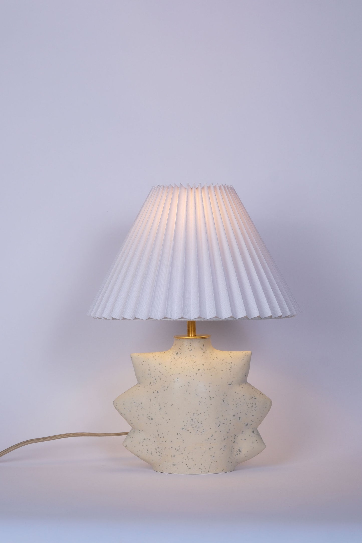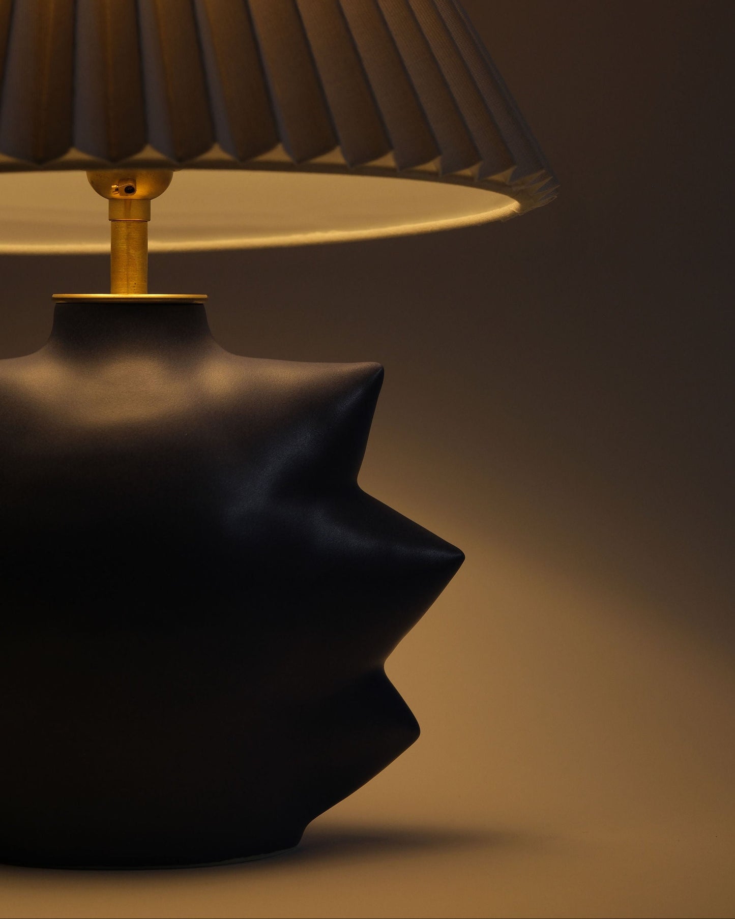 Sculptural and compact, the Star Lamp draws from celestial forms—its rhythmic points echoing the quiet energy of constellations and natural symmetry. Designed to bring warmth and presence to smaller spaces, each base is finished in your choice of glaze: Oat, a warm gritty beige; Lapis, a deep matte cobalt; Smoke, a soft charcoal grey; or Sea Salt, a cool, chalky white. The silhouette is grounded by solid brass hardware throughout, including a custom-made vase cap that adds weight and refinement. Keep in mind that each lamp will have subtle variations in the glaze as it is handmade. Lamp comes without a shade.