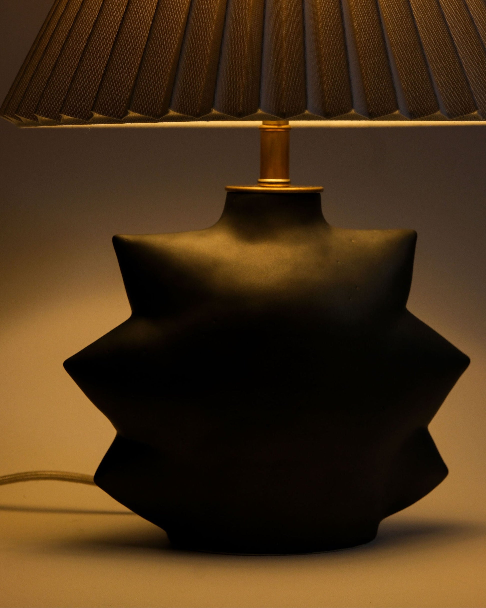 Sculptural and compact, the Star Lamp draws from celestial forms—its rhythmic points echoing the quiet energy of constellations and natural symmetry. Designed to bring warmth and presence to smaller spaces, each base is finished in your choice of glaze: Oat, a warm gritty beige; Lapis, a deep matte cobalt; Smoke, a soft charcoal grey; or Sea Salt, a cool, chalky white. The silhouette is grounded by solid brass hardware throughout, including a custom-made vase cap that adds weight and refinement. Keep in mind that each lamp will have subtle variations in the glaze as it is handmade. Lamp comes without a shade.