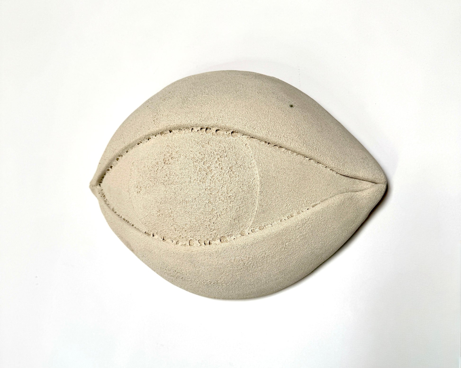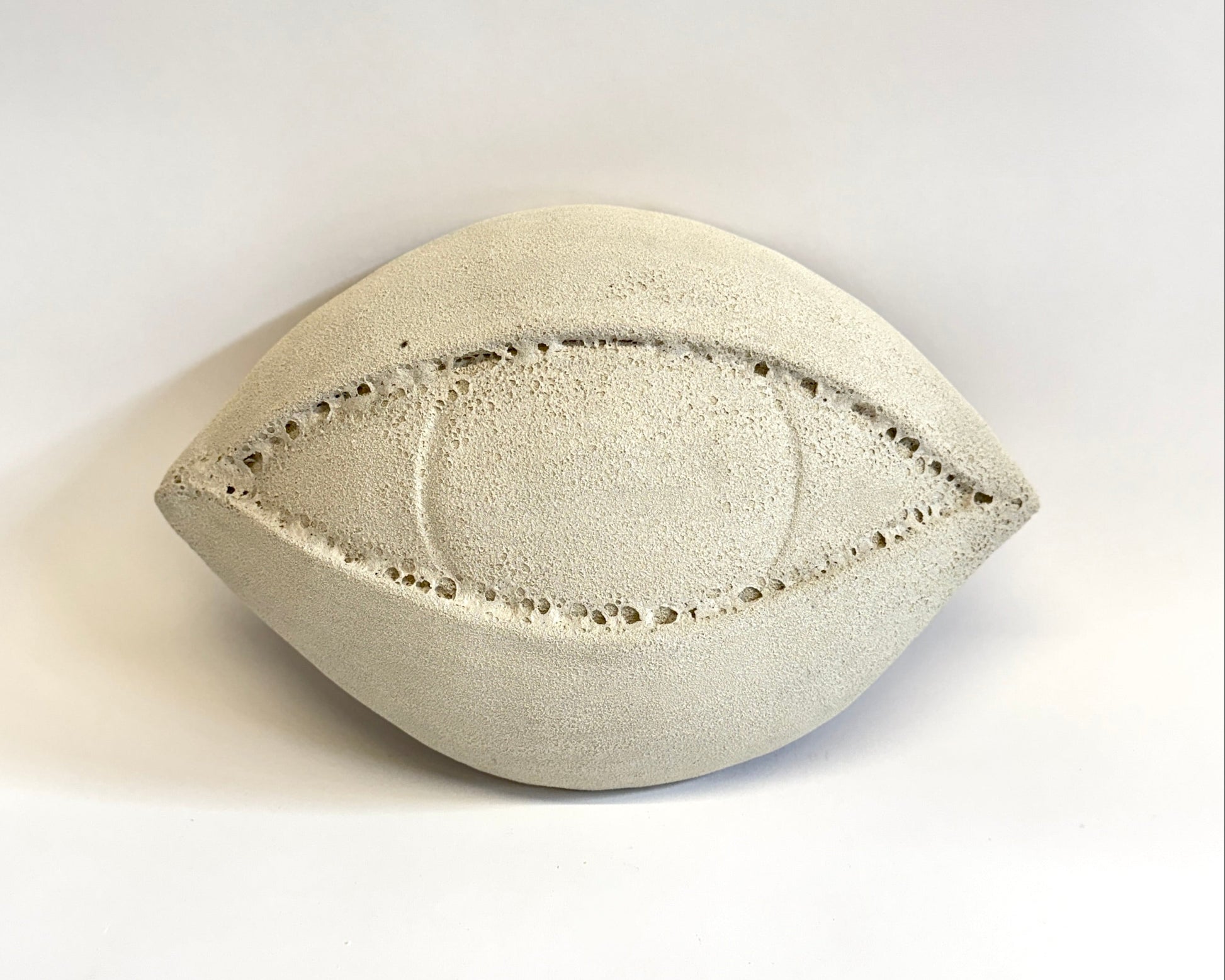A hand built wall hanging sculpture of an eye in a volcanic off white bubbly glaze